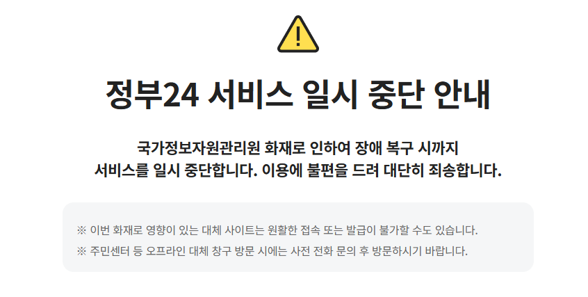 정부24 서비스 일시 중단 안내 국가정보자원관리원 화재로 인하여 장애 복구 시까지 서비스를 일시 중단합니다. 이용에 불편을 드려 대단히 죄송합니다. <!-- 점검 일시 2025. 9. 26. (금) 19:30 ~ 2025. 9